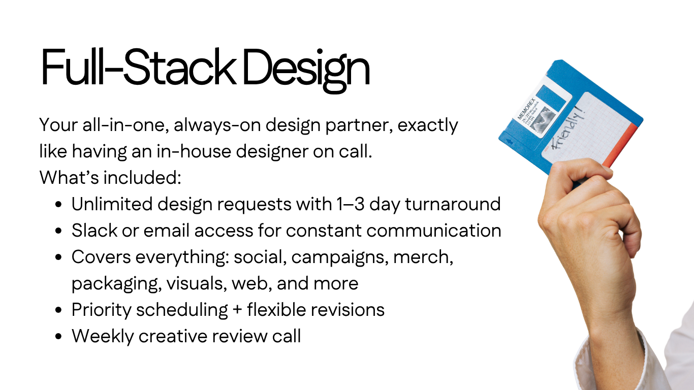 We keep your brand looking good and feeling consistent, without the stress of managing design yourself. Friendly is your go-to design partner for everything from daily creative needs to full-on brand projects. Your creative partner, every step of the way.